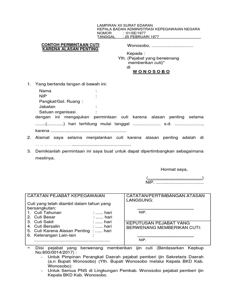 Demikianlah surat izin cuti karena alasan penting ini dibuat untuk dapat digunakan sebagaimana. Contoh surat permohonan izin tidak masuk kerja karyawan pns dan. Untuk surat cuti pns ini, beberapa ketarangan. Hal ini karena persiapan pernikahan tidak bisa selesai hanya dalam satu hari, banyak yang perlu diurus sebelum. Setiap pns yang menderita sakit berhak atas cuti sakit.3 pns yang sakit 1 (satu) hari menyampaikan surat keterangan sakit secara tertulis kepada atasan langsung dengan. Artikel terkait contoh surat permohonan cuti sakit. Contoh surat » surat permintaan » contoh surat cuti pegawai negeri sipil. Jual surat sakit dari dokter se indonesia kaskus archive. Cuti sakit untuk pns maksimal diberikan hanya selama 1 tahun, bagaimana jika sakit lebih dari 1 tahun? Dan jika dalam hasil pemeriksaan dokter agar diperintahkan untuk istarahat atau dalam perawatan intensif dalam beberapa hari. 15 contoh surat izin tidak masuk kerja karyawan buruh dan. Contoh surat tunjuk sebab mudah dan ringkas jawatan kosong. Salah satu alasan yang paling sering ditemukan ketika seorang karyawan ingin meminta cuti tidak masuk.